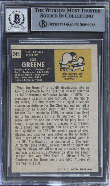 This Autographed Auto 10 1971 Topps #245 Card has been Personally Signed by Joe Greene of the Pittsburgh Steelers. This item is 100% Authentic, it comes slabbed and authenticated by Beckett Authentication Services. The authenticity can be verified on Beckett Authentication Services website.