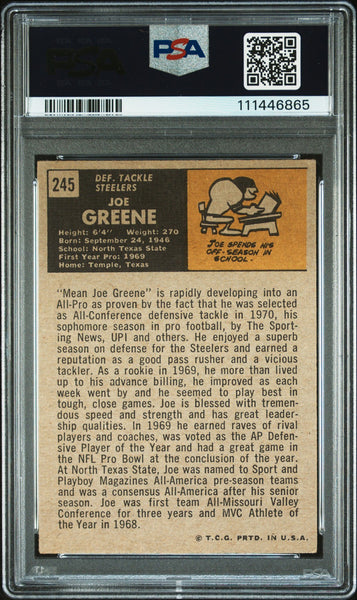 This Autographed Auto Graded Gem Mint 10! 1971 Topps #245 Rookie Card with the inscription of "HOF 87" has been Personally Signed by Joe Greene of the Pittsburgh Steelers. This item is 100% Authentic, it comes slabbed and authenticated by PSA/DNA. The authenticity can be verified on Professional Sports Authenticator website.