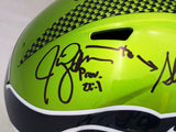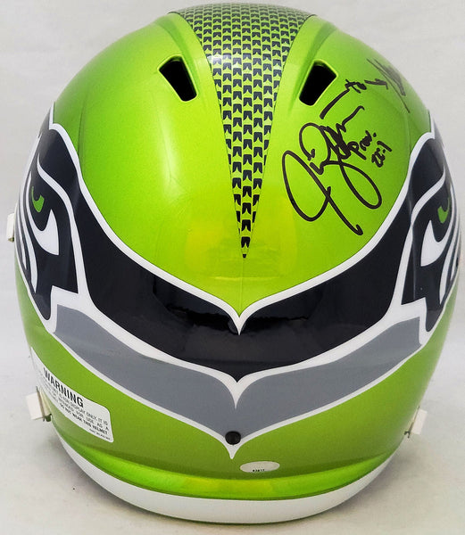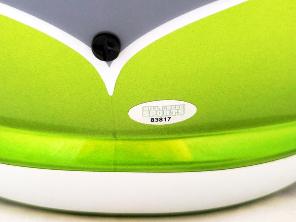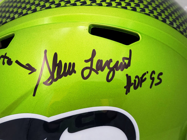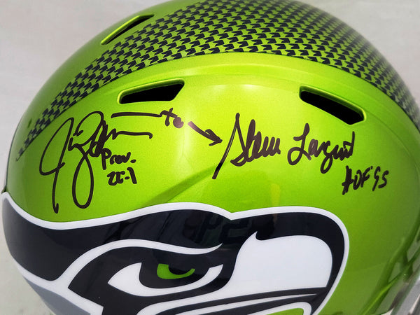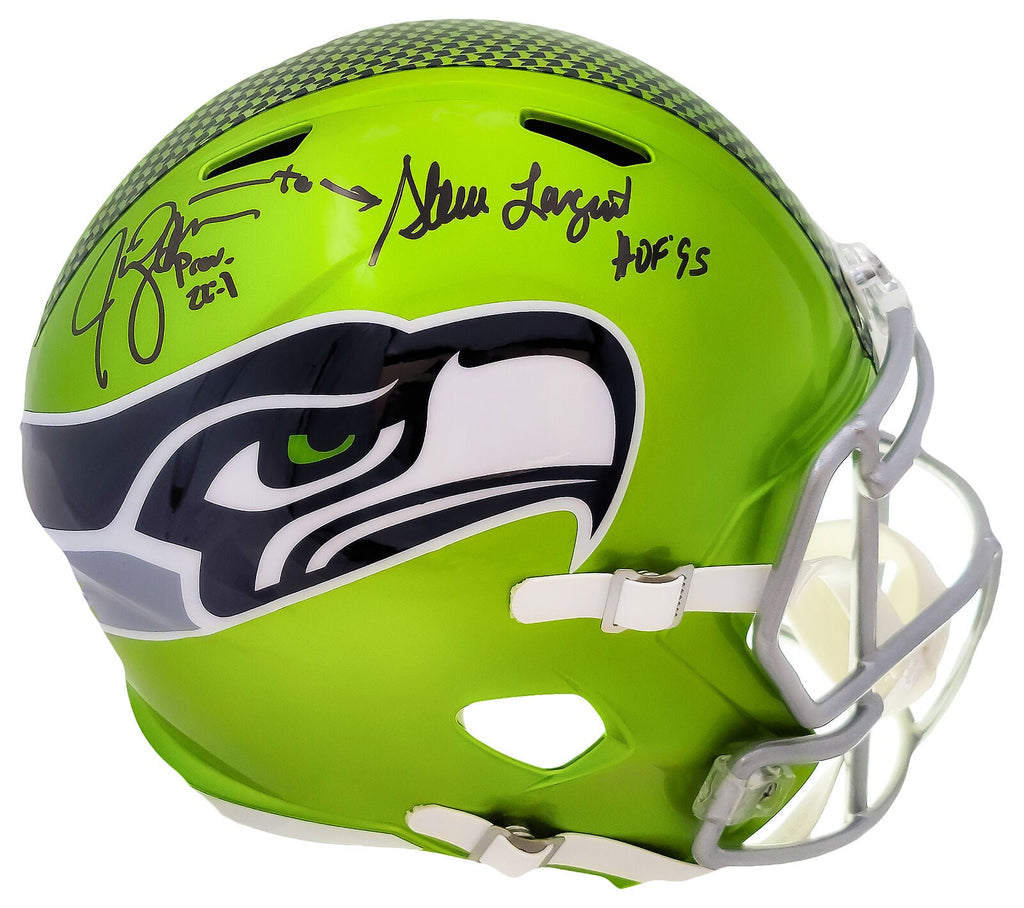 This is a Seattle Seahawks Flash Green Full Size Replica Speed Helmet that has been hand signed by Steve Largent & Jim Zorn. The Flash helmets are delicate and may have some marks or scratches on them. This item was signed in the presence of a Mill Creek Sports representative and comes with their serial numbered hologram and matching certificate of authenticity.