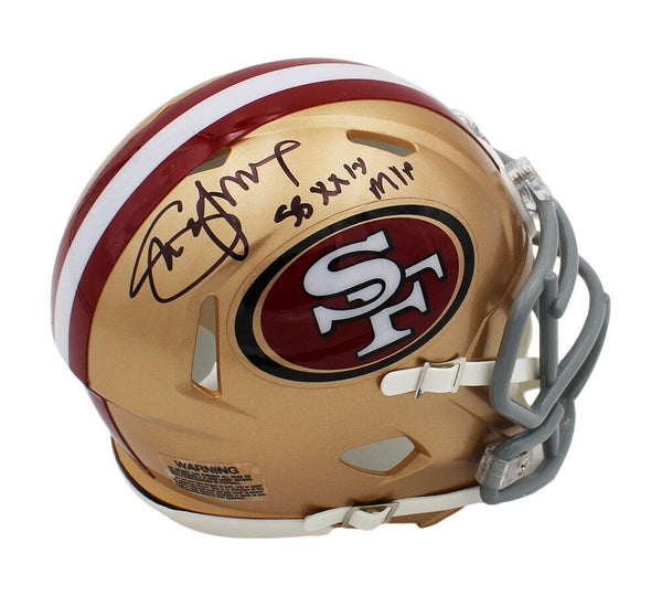 A San Francisco 49ers Speed NFL Mini Helmet hand signed by Steve Young. The item and signature are in excellent condition. In addition to signing his name, Steve also inscribed "SB XXIX MVP" on the item. Steve is a 3x Super Bowl Champion, 7x Pro Bowler, and is a member of the College Football Hall of Fame and the Pro Football Hall of Fame. AUTHENTICATION: Your item is tagged with a SmarTag powered by Prova Technology, which gives you digital access to your items authentication records.