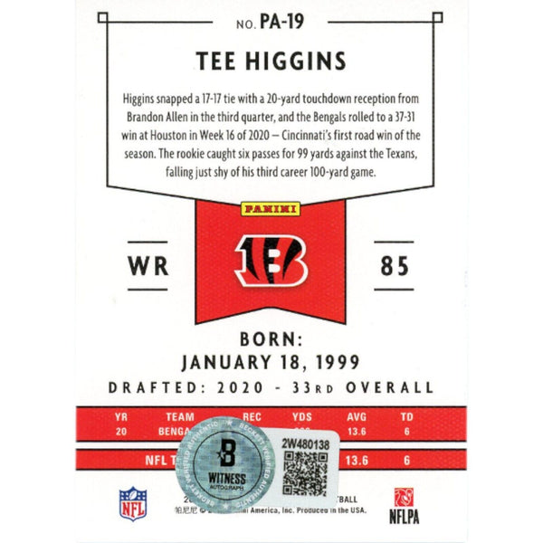 The number in the listing title is just an inventory sku for our records and is not the authentication number. This is a stock photo unless otherwise noted. This is a Cincinnati Bengals Panini Chronicles no. SCR-13 Silver Parallel Trading Card that was personally autographed by Tee Higgins includes "Who Dey" inscription. Includes a certificate of authenticity from Beckett Authentication Services (BAS) and Denver Autographs.FREE SHIPPING within the USA on orders over $10!