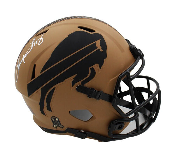 A Buffalo Bills Speed Replica Salute to Service 2 NFL Helmet hand signed by Thurman Thomas. The item and signature are in excellent condition. Thurman was drafted into the NFL in 1988. He was NFL Most Valuable Player in 1991, and is 5x Pro Bowler. AUTHENTICATION: The item is accompanied by a Beckett Serial Numbered and Databased Hologram