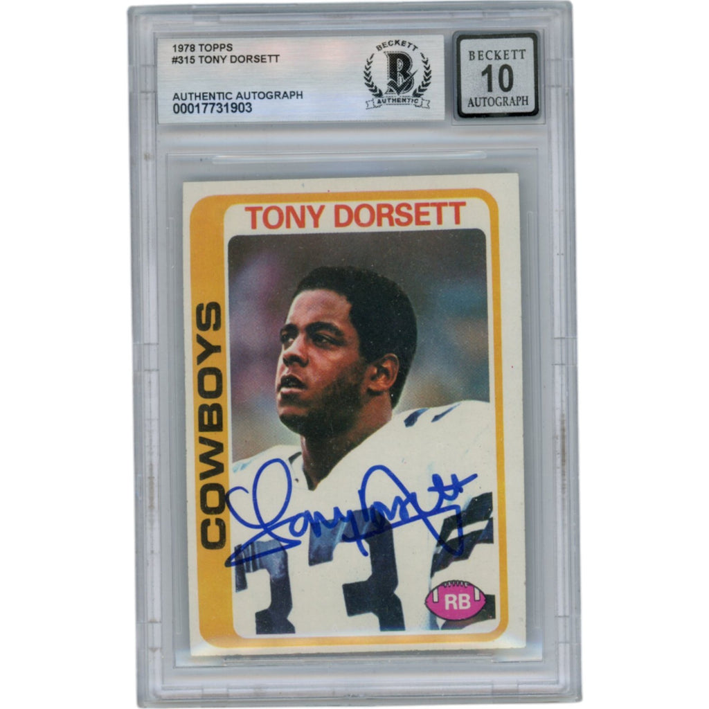 The number in the listing title is just an inventory sku for our records and is not the authentication number. The item pictured is the exact item you will receive, please see photos for condition. This is a Dallas Cowboys 1978 Topps #315 Slabbed Trading Card with a grade 10 autograph that was personally autographed by Tony Dorsett. Includes a certificate of authenticity from Beckett Authentication Services (BAS) and Denver Autographs.FREE SHIPPING within the USA on orders over $10!