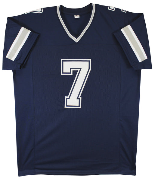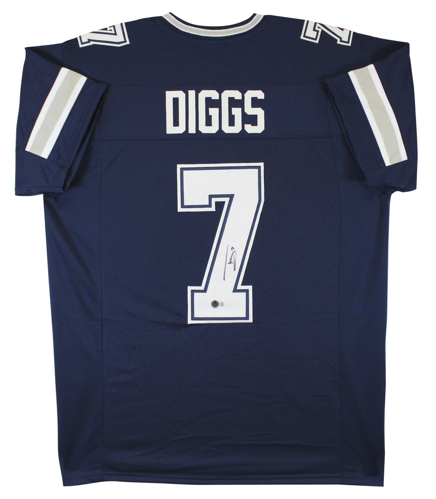 This Autographed Navy Pro Style Jersey has been Personally Signed by Trevon Diggs of the Dallas Cowboys. This item is 100% Authentic to include a hologram by Beckett Authentication Services. This item will come with an affixed Beckett Authentication Services (BAS) authentication sticker, which includes a scannable QR code to verify authenticity. Please note that Beckett no longer provides serial-numbered COA cards, and the attached BAS sticker will serve as the complete authentication for this item. We conducted an autograph signing with Trevon Diggs where multiples of the same item were signed. While the photographs are representative of this item, the size, placement and strength of the signature may vary. Each item is hand signed, therefore, each autograph is unique. This item can be verified through BAS. This is a X-Large sized, non-branded, custom-stitched Jersey.