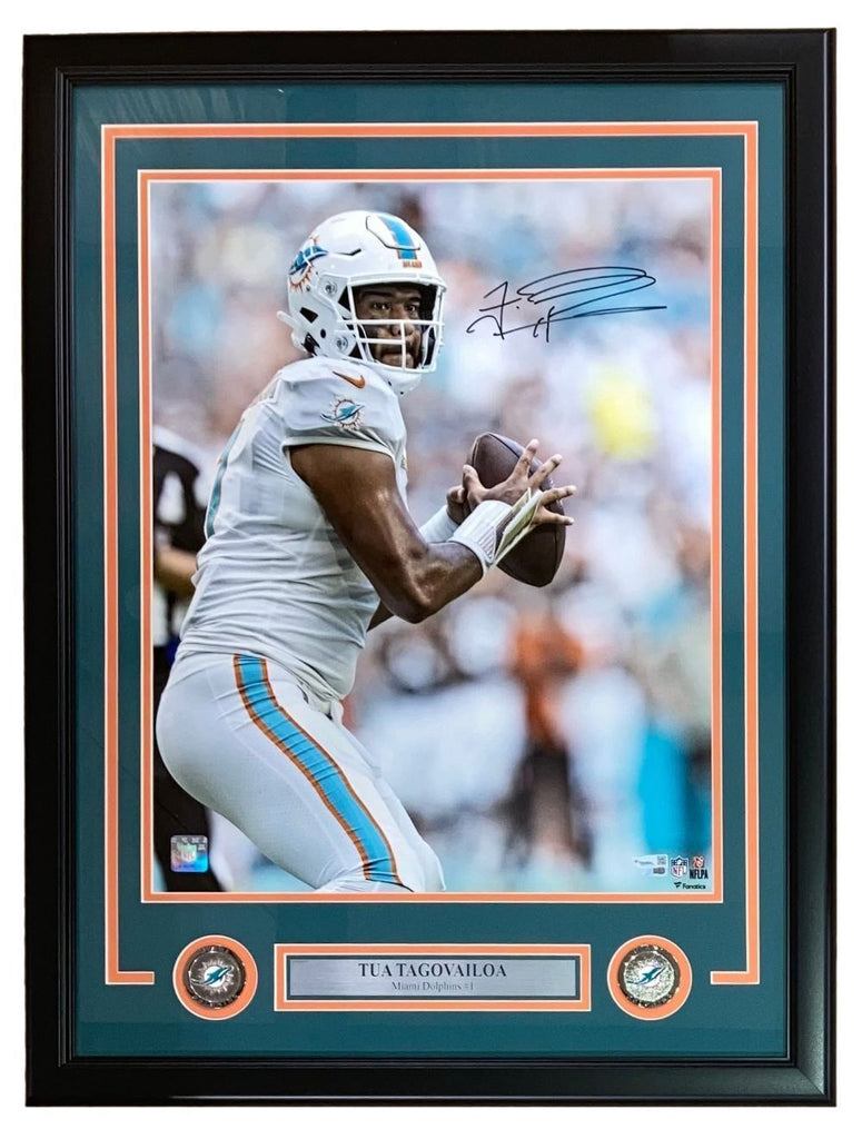 Featured is a Tua Tagovailoa signed 16x20 Miami Dolphins photo. This photo has been hand signed by Tagovailoa and comes with the Fanatics hologram and certificate of authenticity. This photo has been professionally framed and matted and is approximately 22x27. This photo would make a great addition to any sports memorabilia collection!. SPECIFICATIONS Autographed By: Tua Tagovailoa Team: Miami Dolphins Sport: Football Authentication: Fanatics Authentic