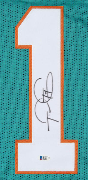Custom on-field style jersey. Everything is sewn on, size XL. Hand-signed by Tua Tagovailoa. The autograph includes an official Beckett Authentication Services serially numbered hologram and QR Code Card for authenticity purposes. The signing of this item was witnessed by Beckett.Authentication: Beckett Hologram with QR Code Card