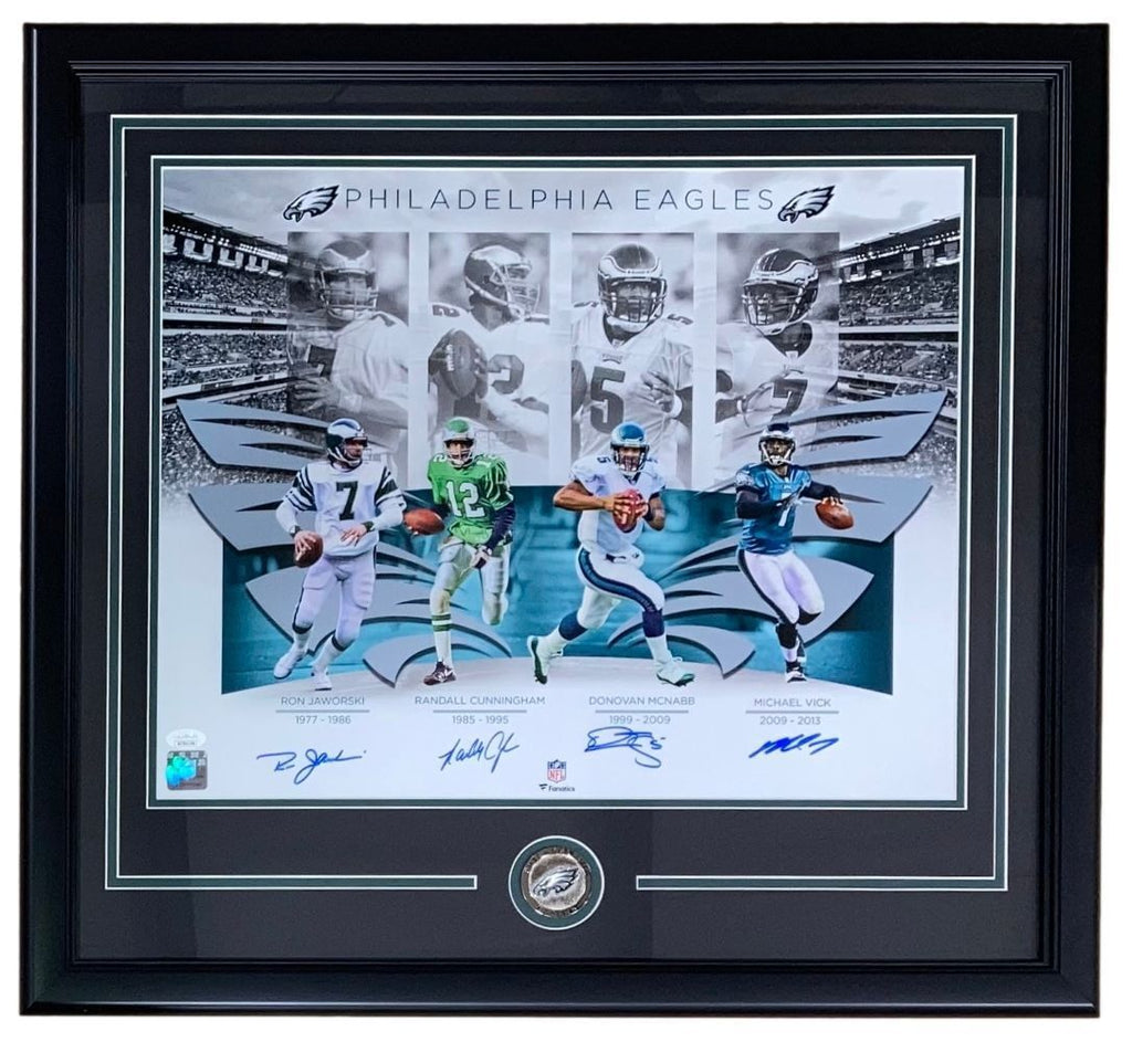 Featured is a Michael Vick, Donovan McNabb, Ron Jaworski, and Randall Cunningham signed 16x20 Philadelphia Eagles photo. This photo was hand signed and comes with the JSA hologram and certificate of authenticity. This photo has been professionally framed and matted and is approximately 22x27. This photo would make a great addition to any sports memorabilia collection!. SPECIFICATIONS Autographed By: Randall Cunningham Team: Philadelphia Eagles Sport: Football Authentication: James Spence Authentication (JSA)