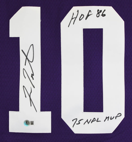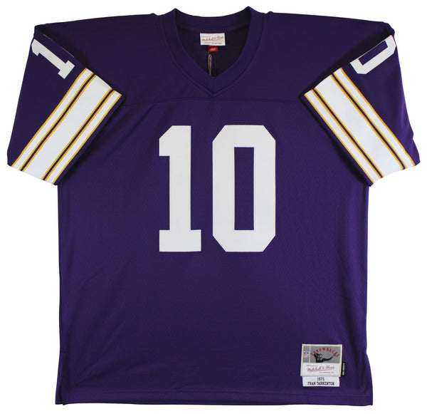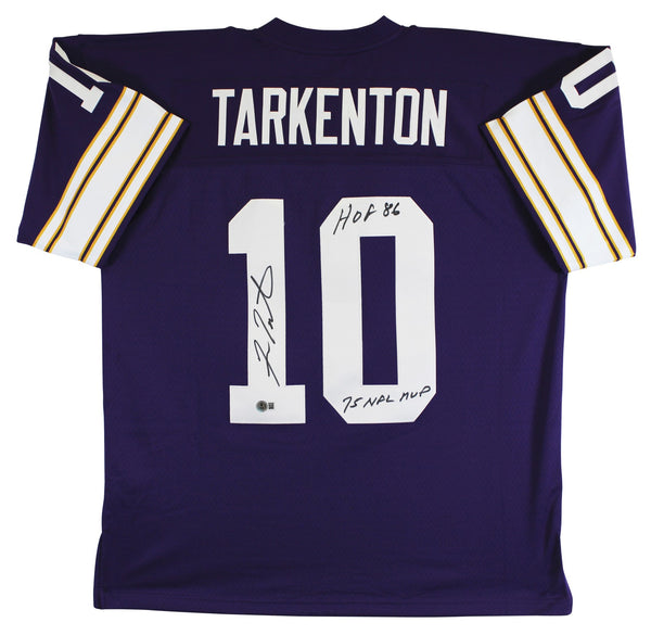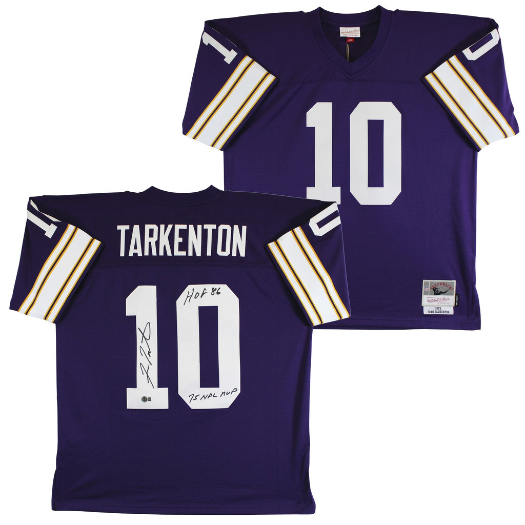 This Autographed Purple Mitchell & Ness Throwback Jersey with the inscription of "HOF 1986, NFL MVP 1975" has been Personally Signed by Fran Tarkenton of the Minnesota Vikings. This item is 100% Authentic to include a hologram by Beckett Authentication Services. This item will come with an affixed Beckett Authentication Services (BAS) authentication sticker, which includes a scannable QR code to verify authenticity. Please note that Beckett no longer provides serial-numbered COA cards, and the attached BAS sticker will serve as the complete authentication for this item. This is a BAS Witnessed Protection Program item which means a Beckett Authentication Service representative was present when this item was being signed. We have multiples of this same item. While the photographs are representative of this item, the size, placement and strength of the signature may vary. Each item is hand signed, therefore, each autograph is unique. Multiple sizes available. Reach out for availability.
