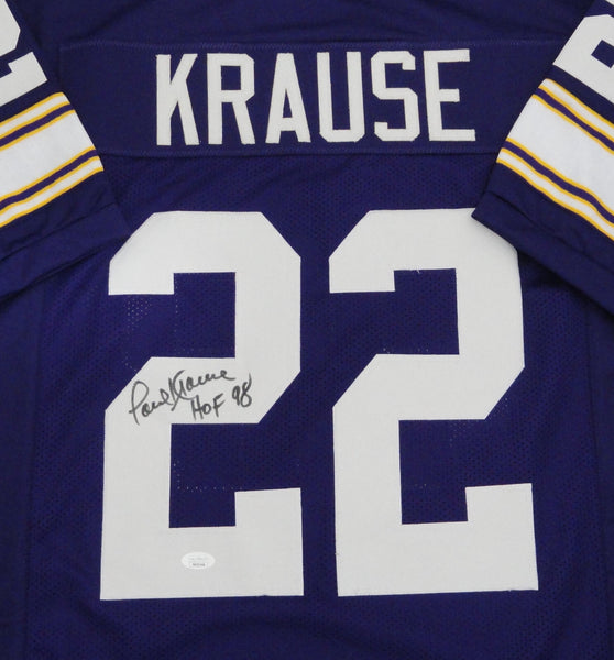 Custom Replica Jersey of Minnesota Vikings Hall of Famer PAUL KRAUSE. This jersey is signed with Black sharpie and includes the inscription "HOF '98". This jersey is size XL has all letters and numbers sewn in. This item was signed at a private signing with us and would make a great addition to any Vikings collection. This item is guaranteed to be 100% authentic and will include a COA from JSA authentication.