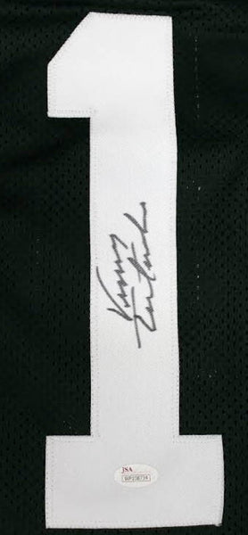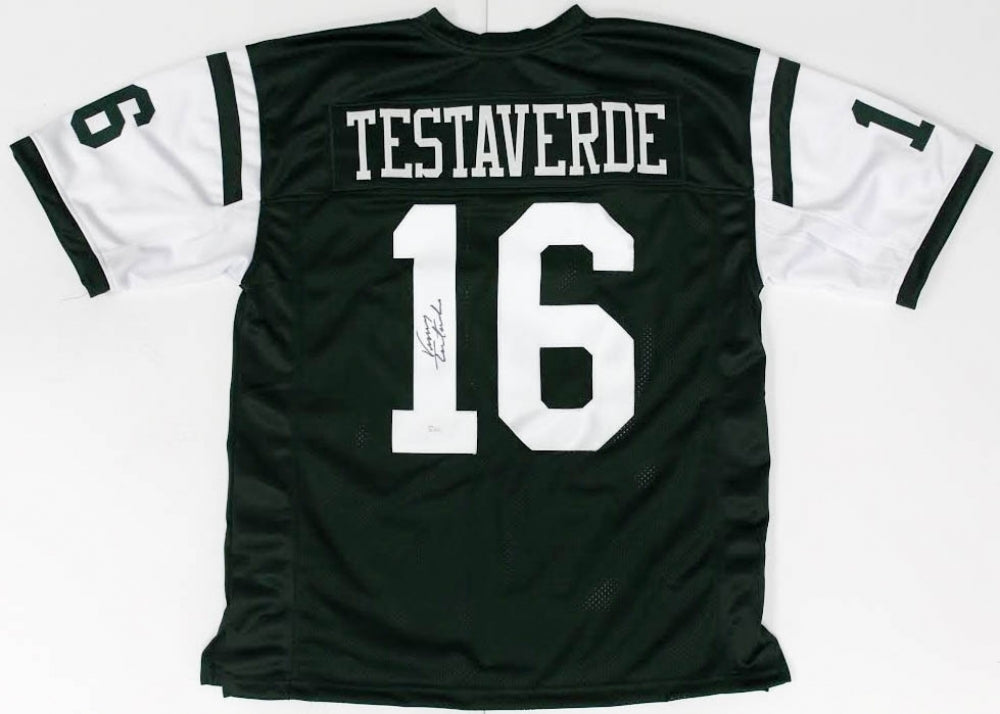 Custom on-field style jersey. Everything is sewn on, size XL. Hand signed in black felt-tip pen by Vinny Testaverde. The autograph includes an official James Spence Authentication (JSA) hologram and scannable QR Code card for authenticity purposes.Authentication: JSA Hologram with Scannable QR Code card