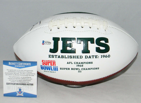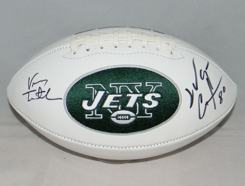 Vinny Testaverde and Wayne Chrebet have each hand signed this New York Jets white panel logo football at a private signing. This item comes with a certificate of authenticity (COA) from Beckett Authentication Services and was signed in the presence of one of their representatives. You will receive a serial-numbered COA along with a matching serial-numbered sticker on the ball. The authenticity can be verified online by entering the serial number.Item pictured may not be the exact item you will receive. It will be similar quality, and we guarantee your satisfaction.