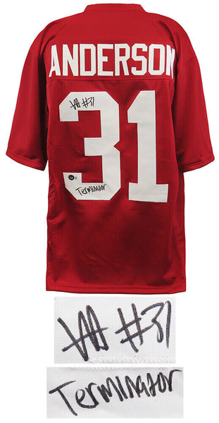 Will Anderson signed red custom college football jersey with 'Terminator' inscription. Item comes with a Beckett Authentication tamper evident numbered sticker and matching Certificate of Authenticity which can be verified online. Jersey is size XL.