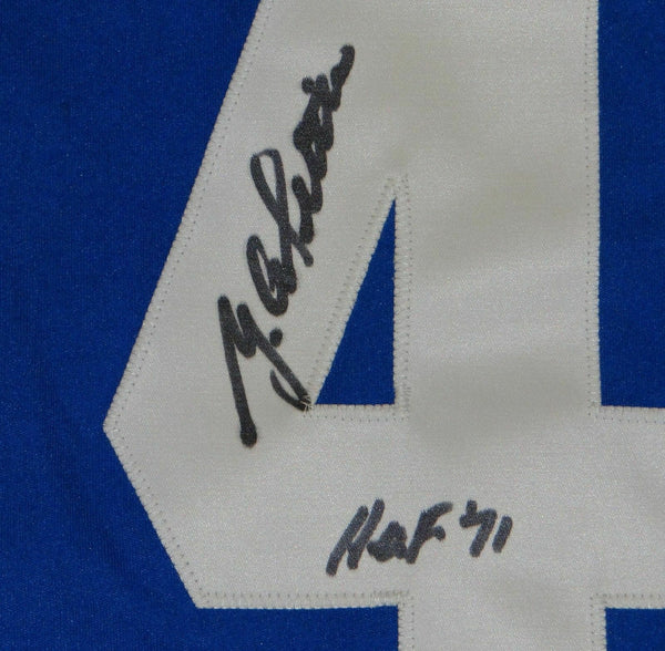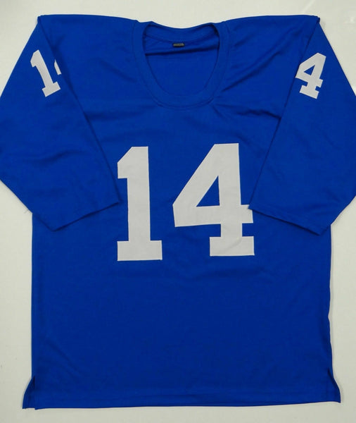 Y.A. Tittle Autographed Blue Pro Style Jersey W/ HOF- JSA Authenticated THIS IS NOT AN NFL JERSEY. THIS HAS NO TAGS, NO LOGOS, NO EMBLEMS. This is a Hand Autographed Jersey of Y.A. Tittle. This is Custom Made (Non Name Brand) Authentic Style (Stitched Letters and Numbers). This item has a James Spence Authentication, which Comes with a JSA #'ed Sticker and a Matching JSA COA. You can view this item on the SpenceLOA website. It was signed either at a public autograph appearance or a Private Signing. This is a stock photo of the item. Although you may not receive this exact item, the item you receive is virtually identical and brand new in great shape. Jersey size is XL.