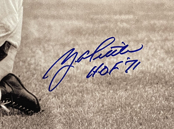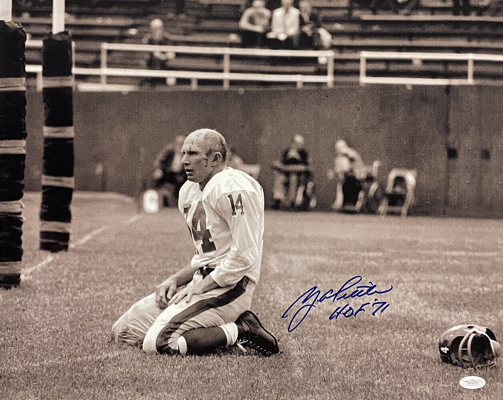 Featured is a Y.A. Tittle signed New York Giants 16x20 defeat photo in which he added the "HOF 71" inscription. This photo was hand signed by Y.A. Tittle and has been authenticated by JSA authentication services. Included with the photo is a JSA hologram only. This photo would make a great addition to any sports memorabilia collection! SPECIFICATIONS Autographed By: Y.A. Tittle Team: New York Giants Sport: Football Authentication: Professional Sports Authenticator (PSA)