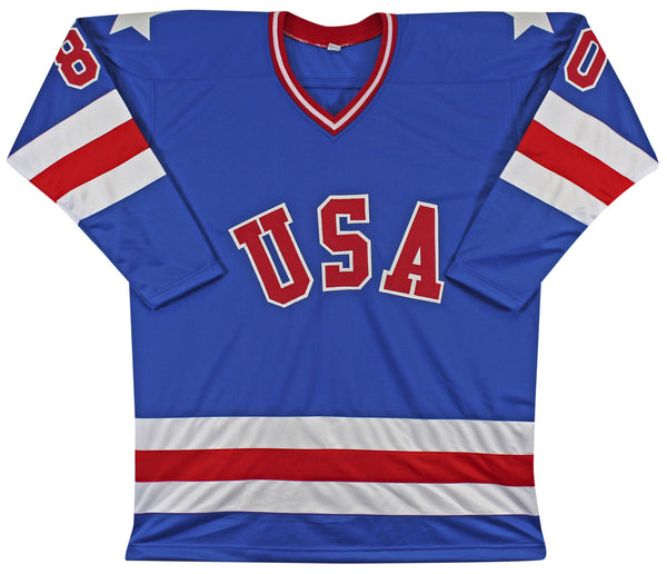 This Autographed Blue Pro Style Jersey with the inscription of "Do You Believe in Miracles?! (Harrington)" has been Personally Signed by Neal Broten, Dave Silk, Rob McClanahan & Mark Johnson, Steve Janaszak, Bill Baker, Dave Christian, Ken Morrow, Jack O'Callahan, Mike Ramsey, Steve Christoff, Mike Eruzione, Buzz Schneider, Eric Stroebel, Phil Verchota, Mark Wells, Craig Patrick, John Harrington & Jim Craig. This item is 100% Authentic to include a hologram by Beckett Authentication Services. This item will come with an affixed Beckett Authentication Services (BAS) authentication sticker, which includes a scannable QR code to verify authenticity. Please note that Beckett no longer provides serial-numbered COA cards, and the attached BAS sticker will serve as the complete authentication for this item. This is a BAS Witnessed Protection Program item which means a Beckett Authentication Service representative was present when this item was being signed. We conducted an autograph signing with Neal Broten, Dave Silk, Rob McClanahan & Mark Johnson, Steve Janaszak, Bill Baker, Dave Christian, Ken Morrow, Jack O'Callahan, Mike Ramsey, Steve Christoff, Mike Eruzione, Buzz Schneider, Eric Stroebel, Phil Verchota, Mark Wells, Craig Patrick, John Harrington & Jim Craig where multiples of the same item were signed. While the photographs are representative of this item, the size, placement and strength of the signature may vary. Each item is hand signed, therefore, each autograph is unique. This item can be verified through BAS Witnessed. This is a X-Large sized, non-branded, custom-stitched Jersey.