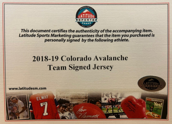 Elevate your collection with this 2018-19 Colorado Avalanche team-signed Adidas jersey, a must-have for any hockey enthusiast. Bearing the signatures of notable players like Gabe Landeskog, Nathan McKinnon, and others, this jersey is a tangible piece of Avalanche history. Verified by , you can be assured of its authenticity. The jersey comes with a certificate of authenticity from LSM, ensuring that each autograph is legitimate. With its vibrant design and significant signatures, this piece is not only a fan favorite but also a standout addition to any sports memorabilia collection. Own a slice of Colorado Avalanche pride with this original, signed jersey.Signatures included:S. VarlomovT. BarrieS. DriesI. CoileN. McKinnonL. O'ConnorC. SoderbergM. RantenenM. NietoD. ToninatoP. GrubauerT. JostJT CompherA. KerfootN. ZadorovM. CalvertS. GirardG. LandeskogC. WilsonJ. Bednar (head coach)E. JohnsonG. BourqueM. BarberioS. AndrighettoP. NemethAJ Greer