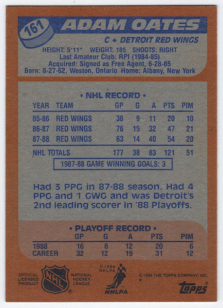 Adam Oates signed Detroit Red Wings 1988 Topps hockey trading card #161. Item comes with a Schwartz Sports Memorabilia tamper-proof numbered hologram (on back of physical card) and Certificate of Authenticity which can be verified online.