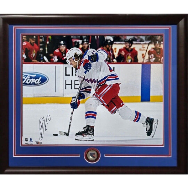 Artemi Panarin Signed 16x20 Framed Photo New York Rangers #10 Autograph Fanatics COA. Hand signed in bold black. Great shot of Panarin shooting the puck. Rangers star #10. Framed in cherrywood with Rangers colored matting and a rangers coin. Final framed dimensions are 27x25... comes ready to hang!