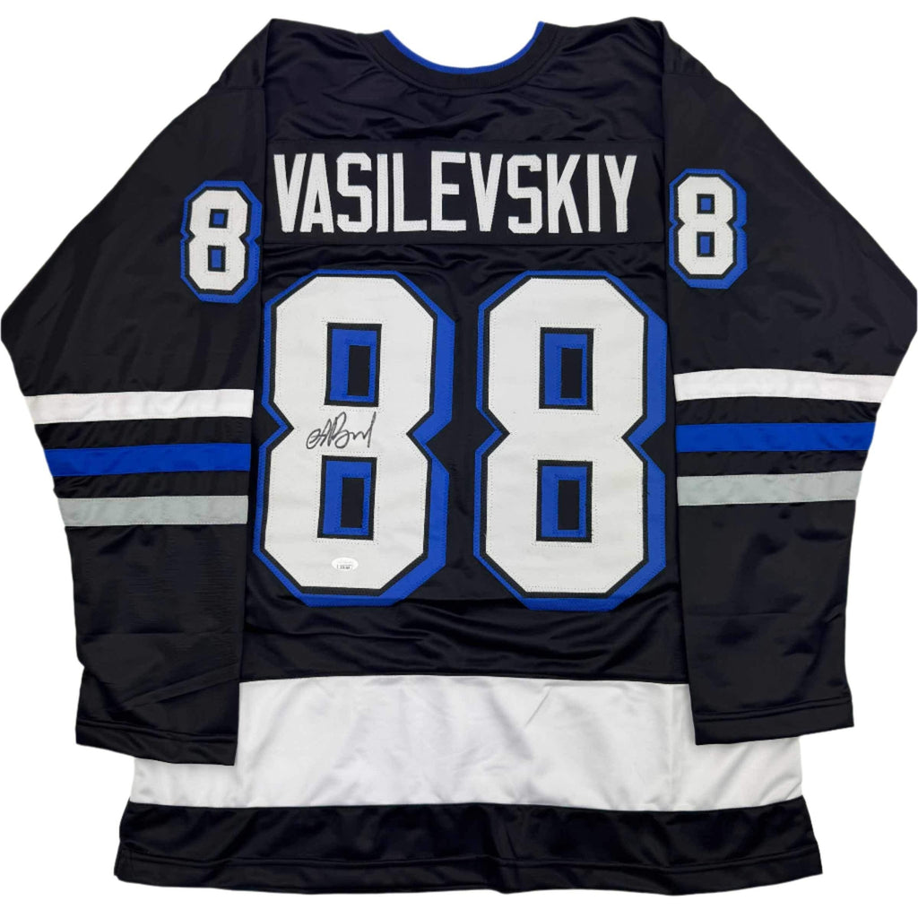 Autographed/Signed Andrei Vasilevskiy Tampa Bay Black Hockey Jersey JSA COA Jersey has no brand names or logos. This is a custom jersey and was not manufactured by or in any manner associated with any professional sports league or manufacturer. This custom jersey carries no professional sports league designation. The item is intended to be an autographed collectible. The custom jersey displays the name and number of the player. This item in no way is affiliated with or connected to any professional sports organization. Size is XL.