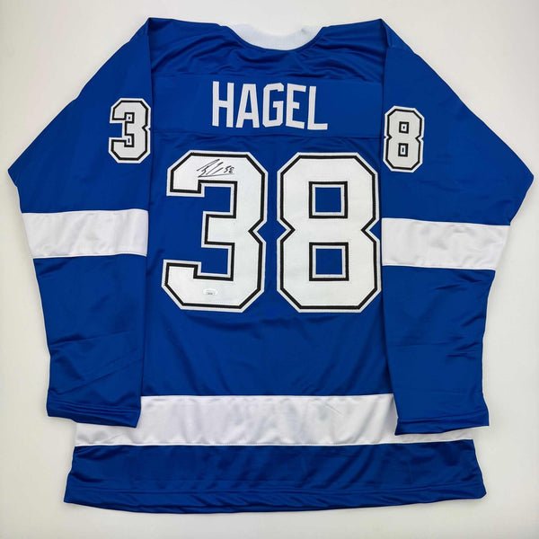 Autographed/Signed Brandon Hagel Tampa Bay Blue Hockey Jersey JSA COA Jersey has no brand names or logos. This is a custom jersey and was not manufactured by or in any manner associated with any professional sports league or manufacturer. This custom jersey carries no professional sports league designation. The item is intended to be an autographed collectible. The custom jersey displays the name and number of the player. This item in no way is affiliated with or connected to any professional sports organization. Size is XL