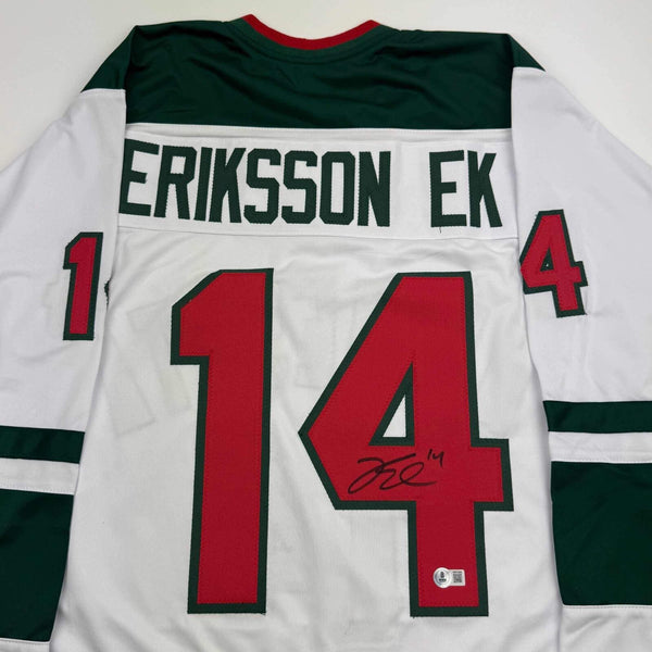 Autographed/Signed Joel Eriksson Ek Minnesota White Hockey Jersey Beckett COA Jersey has no brand names or logos. This is a custom jersey and was not manufactured by or in any manner associated with any professional sports league or manufacturer. This custom jersey carries no professional sports league designation. The item is intended to be an autographed collectible. The custom jersey displays the name and number of the player. This item in no way is affiliated with or connected to any professional sports organization. Size is XL