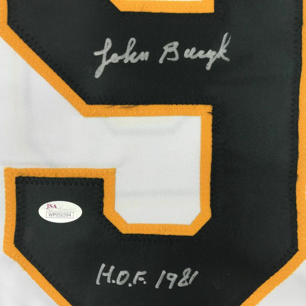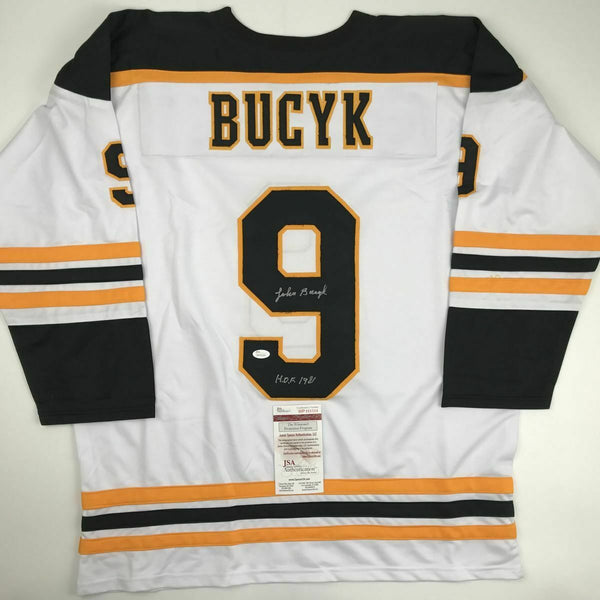 Autographed/Signed JOHNNY JOHN BUCYK HOF 1981 Boston White Hockey Jersey JSA COA This is a custom jersey and was not manufactured by or in any manner associated with any professional sports league or manufacturer. This custom jersey carries no professional sports league designation. The item is intended to be an autographed collectible. Reference of team in the title is to allow the purchaser a point of association. The custom jersey displays the name, number and authenticated signature of the player. This item in no way is affiliated with or connected to any professional sports organization. The autograph, as always is guaranteed to be authentic and has been certified as authentic by a third-party, trusted authenticator. Size is XL unless otherwise noted.