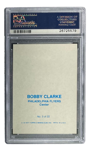 Featured is a Bob Clarke signed Philadelphia Flyers 1977 Topps #3 trading card insert. This card has been hand signed by Clarke and has been authenticated and encapsulated by PSA, receiving a Mint 9 autograph grade. SPECIFICATIONS Autographed By: Bob Clarke Team: Philadelphia Flyers Sport: Hockey Authentication: Professional Sports Authenticator (PSA)