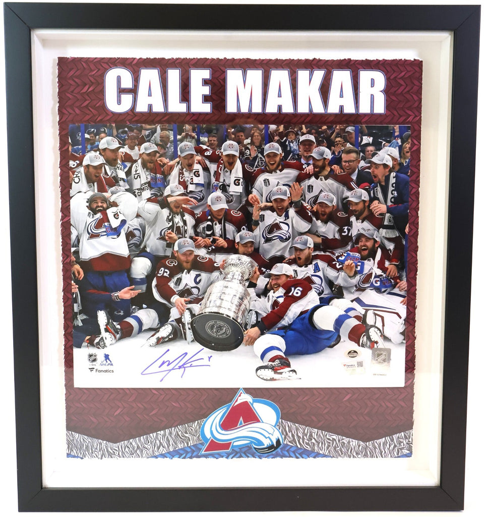 The product is an 11"x14" framed photo of Cale Makar, an autographed original piece with authentication from Fanatics Authentic. The photo features the player's signature and is associated with the Colorado Avalanche team. This collectible item is perfect for fans of hockey and the NHL looking to display a piece of memorabilia from their favorite player.Framed Size 18.5"x20"