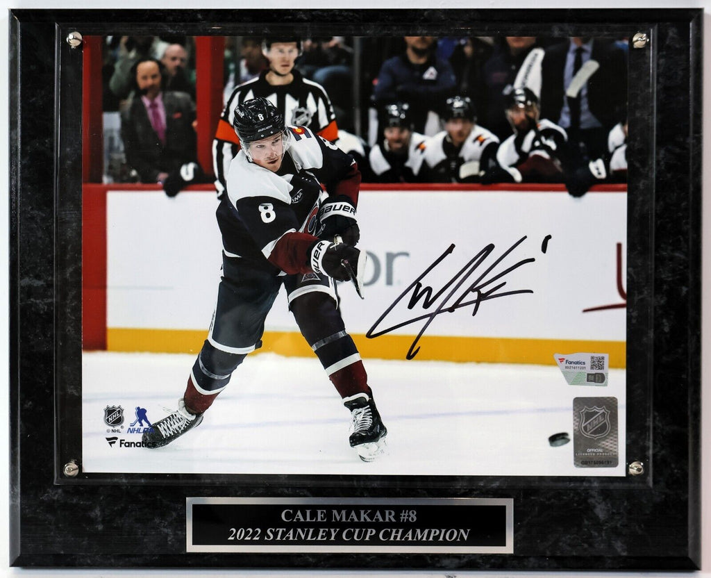 The product is an autographed 8x10 photo of Colorado Avalanche hockey player Cale Makar, accompanied by a plaque. The autograph has been authenticated by Fanatics Authentic, ensuring its authenticity. This collectible item would be a prized possession for fans of Makar or the Colorado Avalanche, adding a personal touch to their sports memorabilia collection. The unique combination of the signed photo and plaque makes it a standout piece for showcasing their admiration for the player and the team.