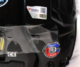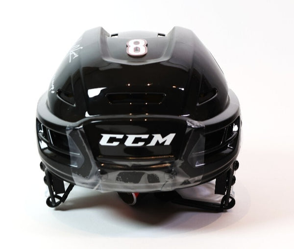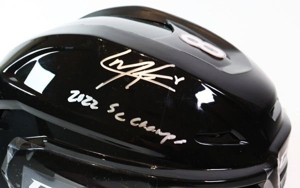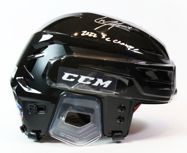 Cale Makar Autographed Black Helmet with the inscription "2022 SC Champs", accompanied by Fanatics Authentic hologram Certifiying its Authenticity. This original autographed item is signed and inscribed by Cale Makar of the NHL and is a collectible piece for hockey fans.