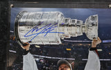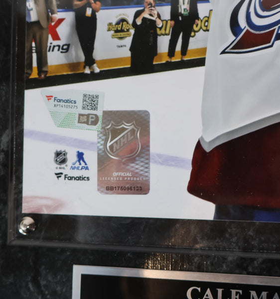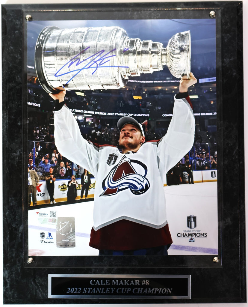 Celebrate the 2022 Stanley Cup win with a limited-edition Cale Makar autographed with blue ink 8x10 plaque! Featuring a marbled black backing, this plaque captures the moment of Makar holding the Stanley Cup. Perfect for any fan or collector!