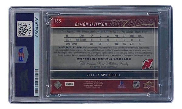 Featured is a Damon Severson signed 2015 Upper Deck SPX #165 New Jersey Devils trading card. This card has been hand signed by Severson and has been authenticated and encapsulated by PSA. This card would make a great addition to any sports memorabilia collection!. SPECIFICATIONS Autographed By: Damon Severson Team: Sport: Hockey Authentication: Professional Sports Authenticator (PSA)
