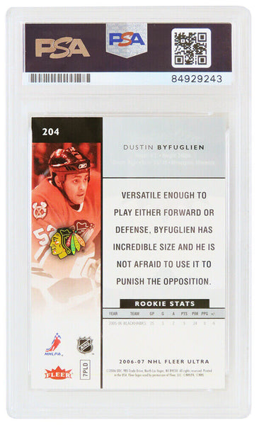 Dustin Byfuglien signed Chicago Blackhawks 2006-07 Fleer Ultra rookie hockey card #204. The card has been authenticated and encapsulated by PSA/DNA and the number can be verified online. The image of the item is a stock photo, as we may have multiples of the item in stock. The Slabbed Card you will receive will be of the card described. (Same grade, Same authentication) You may or may not receive the exact PSA serial number on the slab label shown in image.