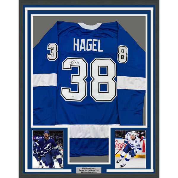 Framed Autographed/Signed Brandon Hagel 35x39 Tampa Bay Blue Jersey JSA COA The item is professionally framed and matted with two 5x7 photos, measures 35x39 inches and is ready to be hung in your man cave! Photo and matting requests can be made.