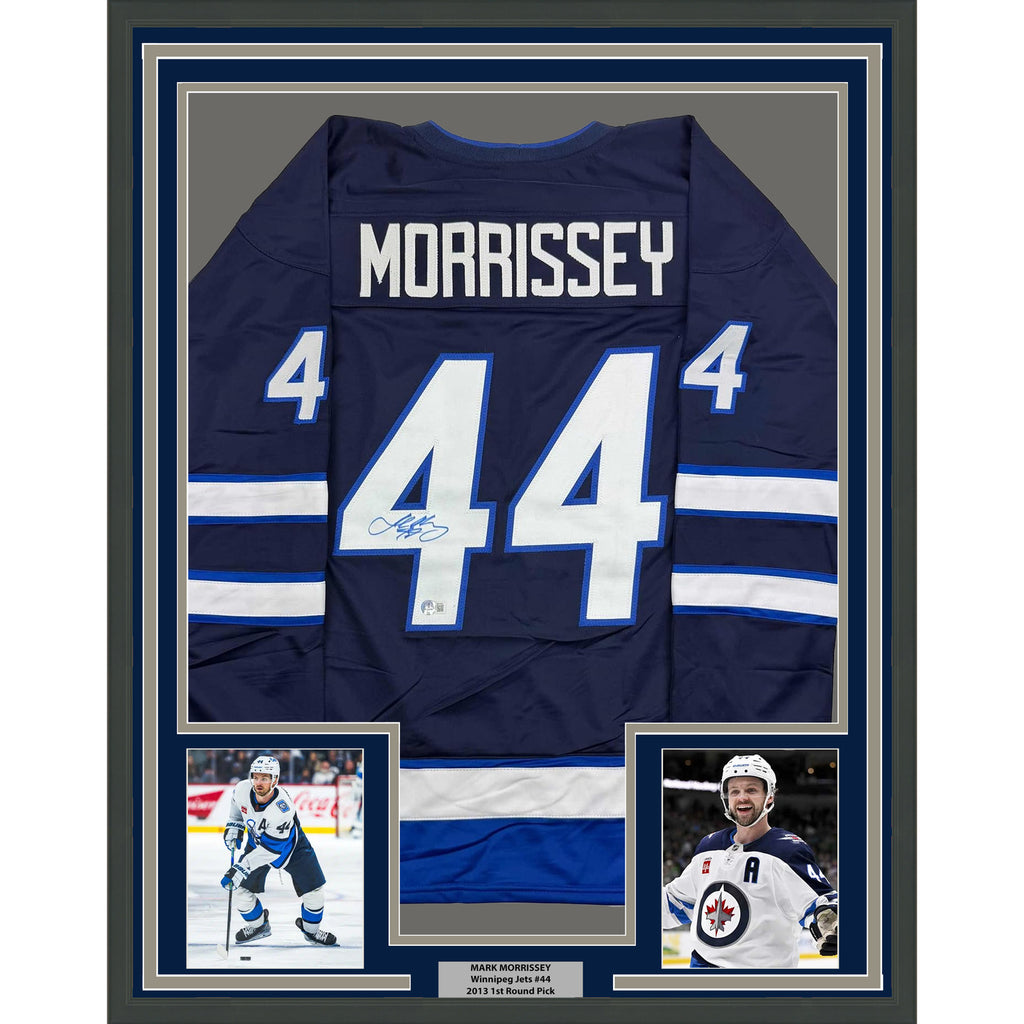 Framed Autographed/Signed Josh Morrissey 35x39 Blue Hockey Jersey Beckett COA The item is professionally framed and matted with two 5x7 photos, measures 35x39 inches and is ready to be hung in your man cave! Photo and matting requests can be made.