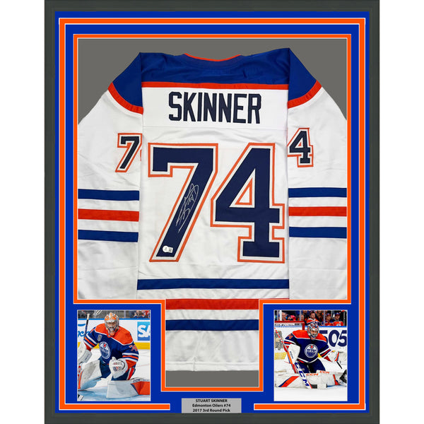 Framed Autographed/Signed Stuart Skinner 35x39 Edmonton White Jersey BAS COA The item is professionally framed and matted with two 5x7 photos, measures 35x39 inches and is ready to be hung in your man cave! Photo and matting requests can be made.