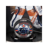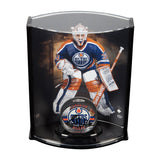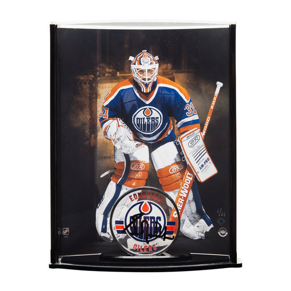 Grant Fuhr began his NHL career at the young age of 19 after being selected by his hometown team, the Edmonton Oilers. His best career year was in 1987 when he recorded a league-leading 4,304 minutes played and 40 wins. That season he was awarded the Vezina Trophy and was also the runner-up to Wayne Gretzky for the Hart Trophy, awarded to the NHL's most valuable player. Fuhr has five Stanley Cup rings and a Canada Cup as well. Fuhr played in six All-Star Games, and in the 1988 playoffs, he recorded an impressive 16-2 record with a Stanley Cup win to end it. This patented curve display contains a limited edition (31) Goaltender 8" x 10" image of Fuhr with an autographed acrylic Edmonton Oilers puck in black paint pen. His autograph has been authenticated by virtue of Upper Deck Authenticated's Five Step Process.
