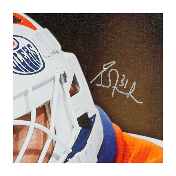 Grant Fuhr is most remembered for the five Stanley Cup championships he led the Oilers to between 1984 and 1990. In the 1983-84 season, Fuhr broke an impressive record by recording 14 points, and he still holds the record today. Fuhr played alongside other Oilers legends such as Wayne Gretzky, Mark Messier, Paul Coffey and Jari Kurri. Fuhr's number has been retired by the Oilers and in 2003 he was inducted into the Hockey Hall of Fame. Fuhr has signed this Up Close & Personal 20" x 24" stretched canvas in silver paint pen. His signature is deemed authentic by virtue of Upper Deck Authenticated's Five-Step Process.