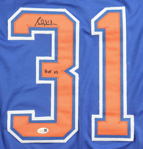 Custom on-ice style jersey. Everything is sewn on, size XL. Hand-signed and inscribed in black felt-tip pen by Grant Fuhr (Edmonton Oilers, HOF). The lot / autograph(s) includes an official James Spence Authentication (JSA) scannable hologram and QR Code card for authenticity purposes. The signing of this item was witnessed by JSA.Authentication: JSA Scannable Hologram & QR Code card