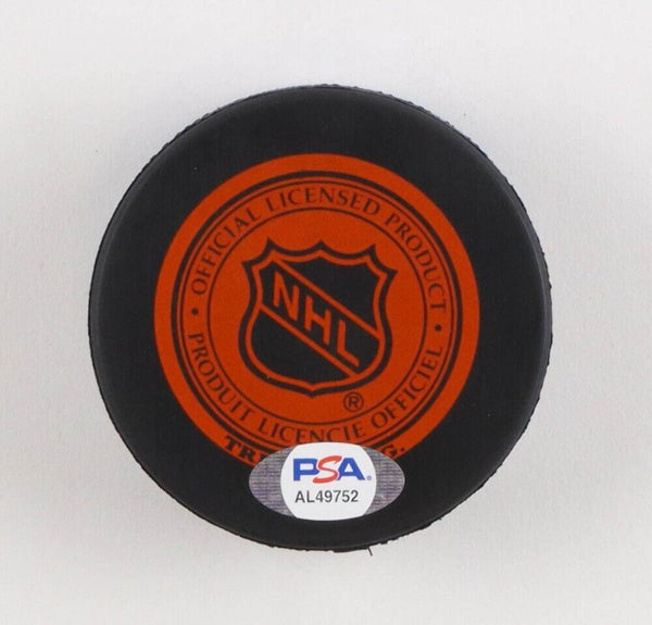 Montreal Canadiens logo hockey puck. Hand-signed in silver paint pen by Jean Beliveau (Canadiens, HOF, D.2014). The autograph includes an official PSA/DNA hologram and matching COA for authenticity purposes.