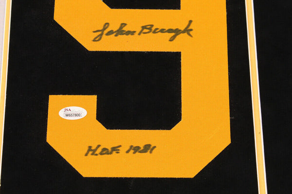 Custom matted display measures approximately 22" x 24" in size and features a #9 jersey patch that is hand-signed and inscribed by Johnny Bucyk (Boston Bruins, HOF).Please note, there are some nicks in the matte of the display.The lot / autograph(s) includes an official James Spence Authentication (JSA) hologram for authenticity purposes. The signing of this item was witnessed by JSA.Authentication: JSA Hologram