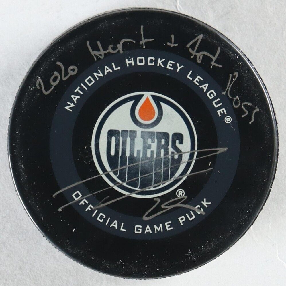 Edmonton Oilers logo hockey puck has been hand-signed and inscribed by Leon Draisaitl.The lot / autograph(s) includes an official Fanatics hologram for authenticity purposes.Authentication: Fanatics Hologram