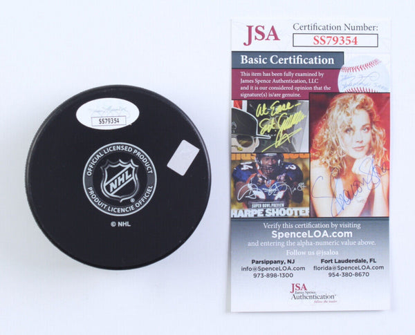 Toronto Maple Leafs Logo Hockey puck. Hand-signed in silver paint pen by Mark Giordano (Flames). The autograph includes an official JSA hologram and matching COA for authenticity purposes.Authentication: JSA COA
