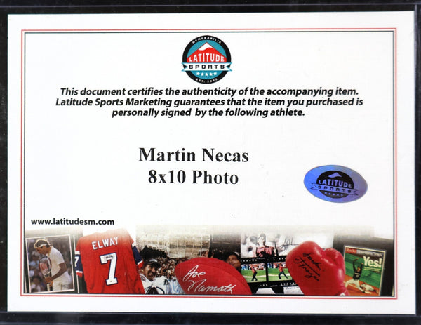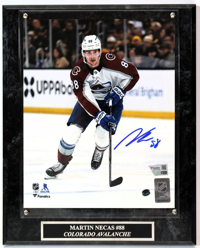 The product is an autographed 8x10 photo of hockey player Martin Necas with a plaque, authenticated by Fanatics Authentic. The photo features a signature from the player and comes with a Certificate of Authenticity from Fanatics. The Colorado Avalanche team is associated with the product, making it a collectible item for fans of the team or the player. This unique and valuable piece would be a great addition to any sports memorabilia collection.