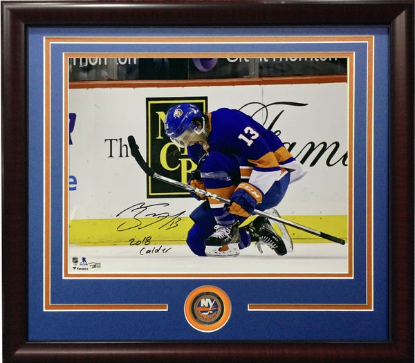 Mathew Barzal Islanders rising star hand signed 16x20 photo inscribed "2018 Calder"!!! Custom framed in beautiful cherry wood with an Islanders coin and ready to hang. The final framed dimensions are approximately 23x30. Fanatics certified! You can verify your fanatics hologram on their website
