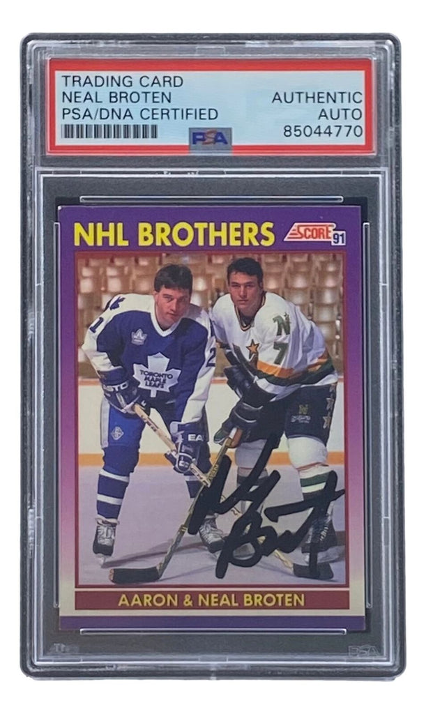 Featured is a Neal Broten signed 1991 Score #307 Minnesota North Stars trading card. This card has been hand signed by Broten and has been authenticated and encapsulated by PSA. This card would make a great addition to any sports memorabilia collection!. SPECIFICATIONS Autographed By: Neal Broten Team: Sport: Hockey Authentication: Professional Sports Authenticator (PSA)