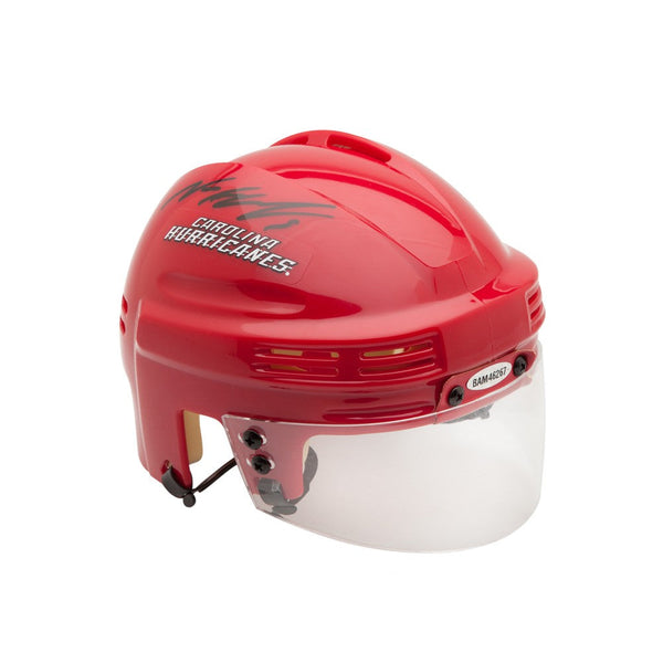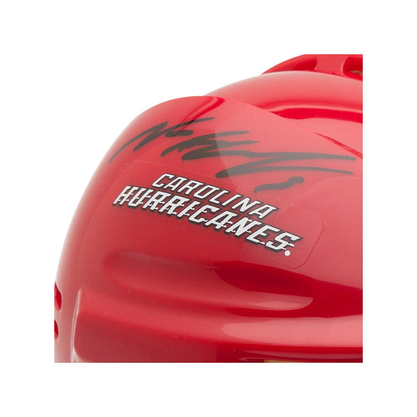 Noah Hanifin was selected in the top five of the 2015 NHL Entry Draft by the Carolina Hurricanes. He was the highest rated defenseman of the draft, and there was plenty of hype around this young player. Hanifin uses his size and skill to have a significant defensive presence on the ice. Hanifin played for the U.S. National Development Team and then went on to play a season at Boston College. After being selected with the fifth overall pick, he made the team straight out of training camp and played 79 games in his rookie season. Hanifin has signed this red Carolina Hurricanes mini helmet in black paint pen. His signature is deemed authentic by virtue of Upper Deck Authenticated's Five Step Process.
