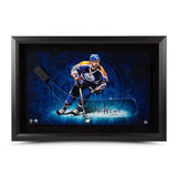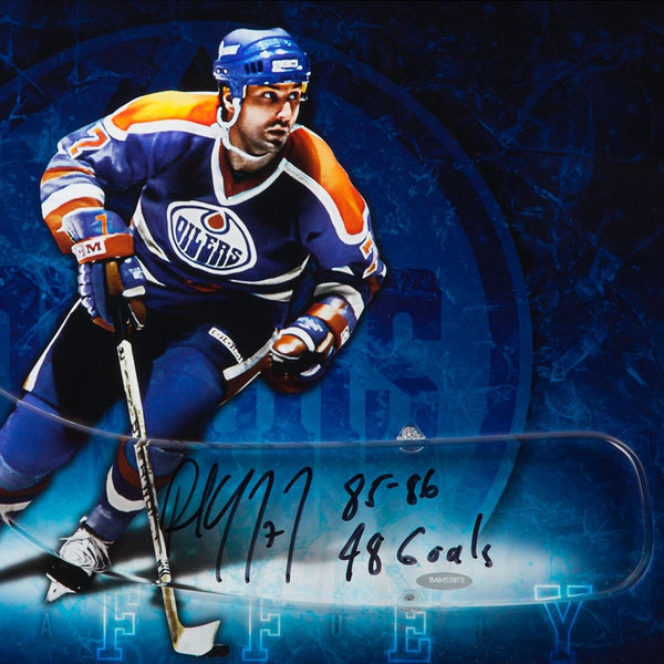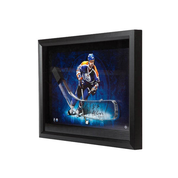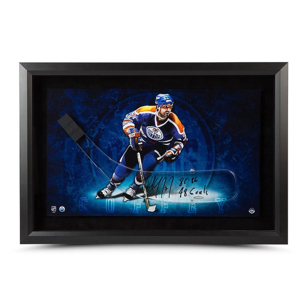 Paul Coffey scored over 100 points in five seasons of his 21-season career in the National Hockey League. While playing for the Edmonton Oilers, Coffey recorded two seasons with 40+ goals. Coffey won four Stanley Cup championships during his career, with three of them occurring from 1984 to 1987. When Coffey retired after the 2000-01 season, he had amassed 396 goals, 1,135 assists, and 1,531 points. Fifty-nine of those goals came during the Stanley Cup playoffs, and not one of them was into an empty net. In the 1985-86 season, Coffey broke Bobby Orr's record for most goals in a season by a defenseman when he scored 48 goals. This specially designed shadow box contains a 20"x12" UDA designed Edmonton Oilers image with an autographed and inscribed clear acrylic stick blade mounted over the image. Coffey has inked his signature and inscription in black paint pen. The overall framed piece measures 24"x16". Coffey's signature was witnessed under UDA's Five-Step Authentication Process.