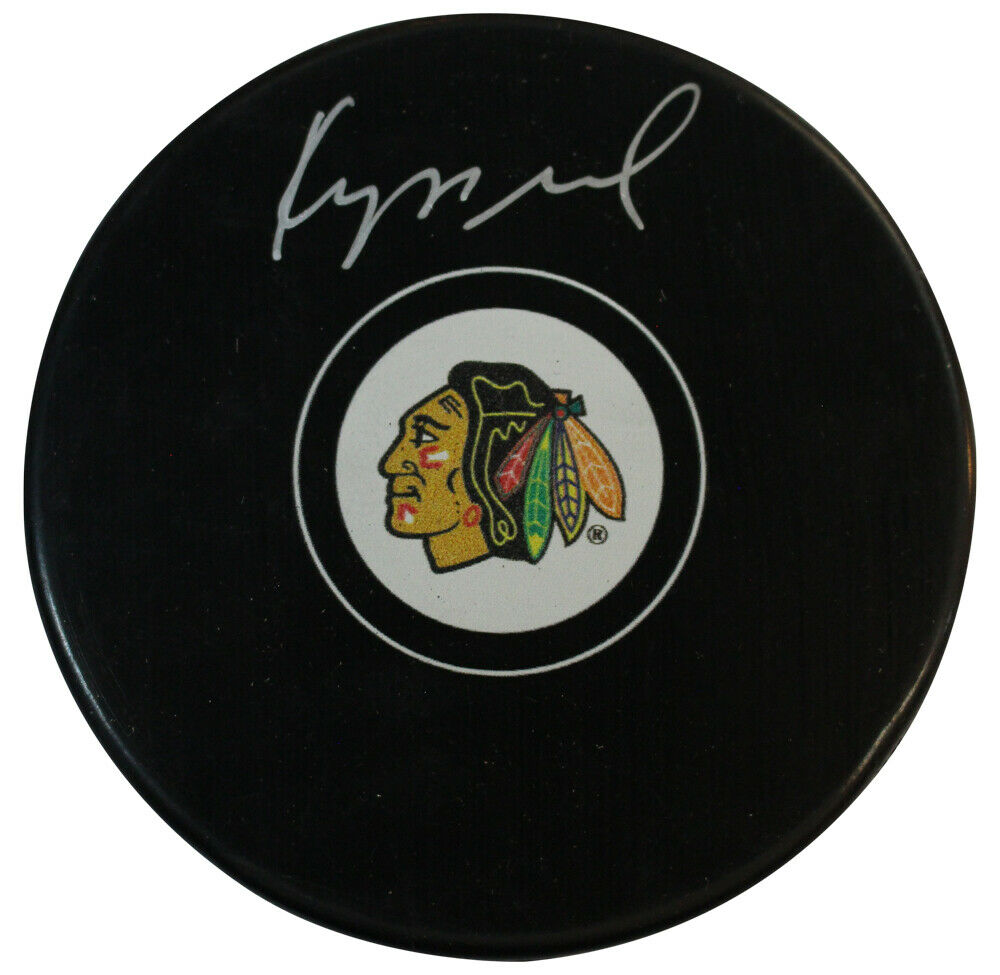 Philipp Kurashev Autographed/Signed Chicago Blackhawks Puck Fanatics 35445 The number in the listing title is just an inventory sku for our records and is not the authentication number. This is the exact item that you will receive so please see pictures for condition. This is a hockey puck that was personally autographed by Philipp Kurashev. Includes a Fanatics Authentic hologram and a certificate of authenticity from Denver Autographs.