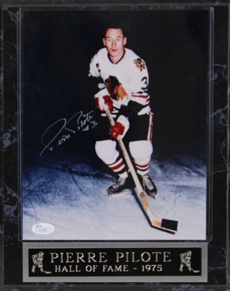 This autographed 8x10 photo, displayed in a plaque measuring 11" x 13" has been personally hand-signed by Pierre Pilote of the Chicago Blackhawks. This autograph is certified by James Spence Authentication (JSA). It comes with the numbered hologram and matching Certificate of Authenticity. The photo is in a top-loader and affixed to the plaque so the photo can easily be removed.
